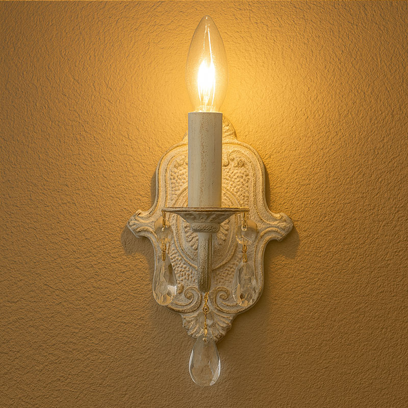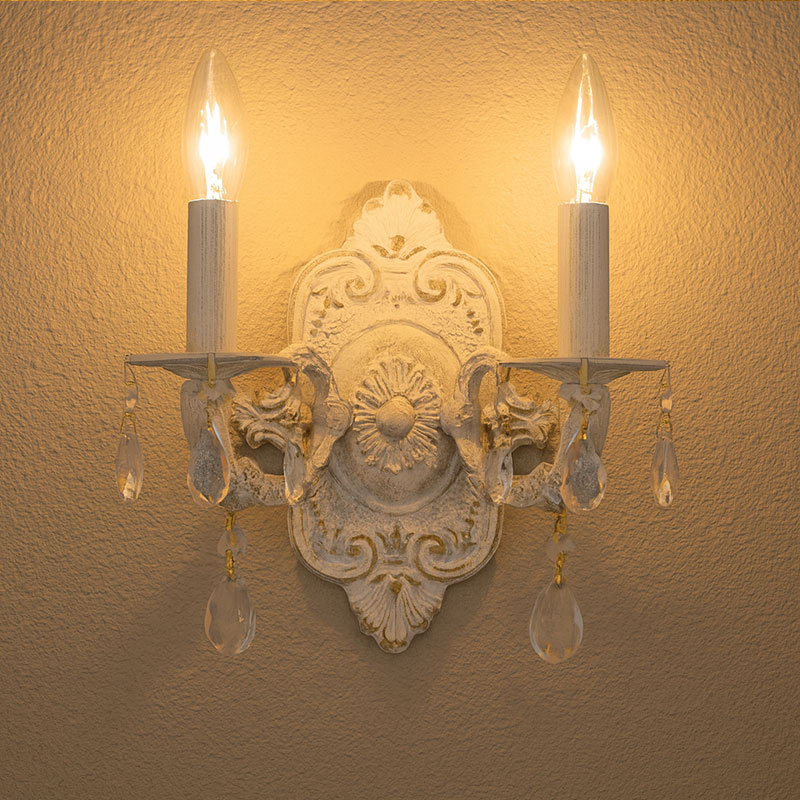 アンティークホワイト仕上げのブラケット照明は、ヨーロッパのクラシックインテリアを思わせる上品なデザイン。繊細な装飾とクリスタル調パーツが、空間を華やかに演出します。1灯タイプと2灯タイプを展開しており、用途やシーンに合わせた使い分けが可能です。