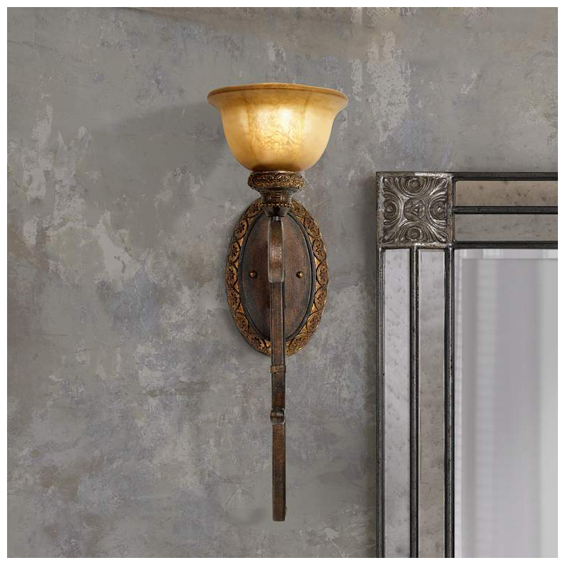 イルミナティ1灯壁付けブラケット照明」は、クラシカルなキャンドル風デザインと、深みのあるブロンズ仕上げが特徴の高級感漂うブラケットライトです。エレガントで温かみのある光が、空間に重厚な雰囲気をプラスします。