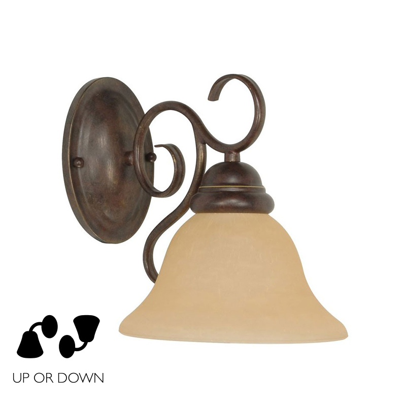 カステロ壁付けブラケット照明」は、温かみのあるソノマブロンズ仕上げとガラスシェードが特徴の輸入ブラケットライト。上向き・下向きの両方で設置できる自在性があり、空間や用途に合わせたアレンジが可能です。1灯タイプと2灯タイプがあり、玄関や廊下、リビングのアクセント照明として幅広く活躍します。
